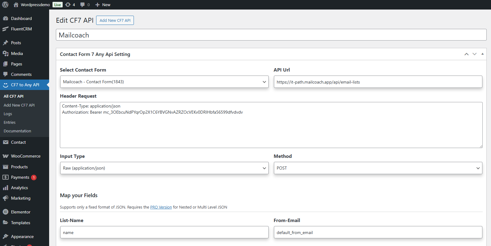 - Field Mapping: Match your CF7 form fields to the Mailcoach API fields (refer to the API docs for correct field names).