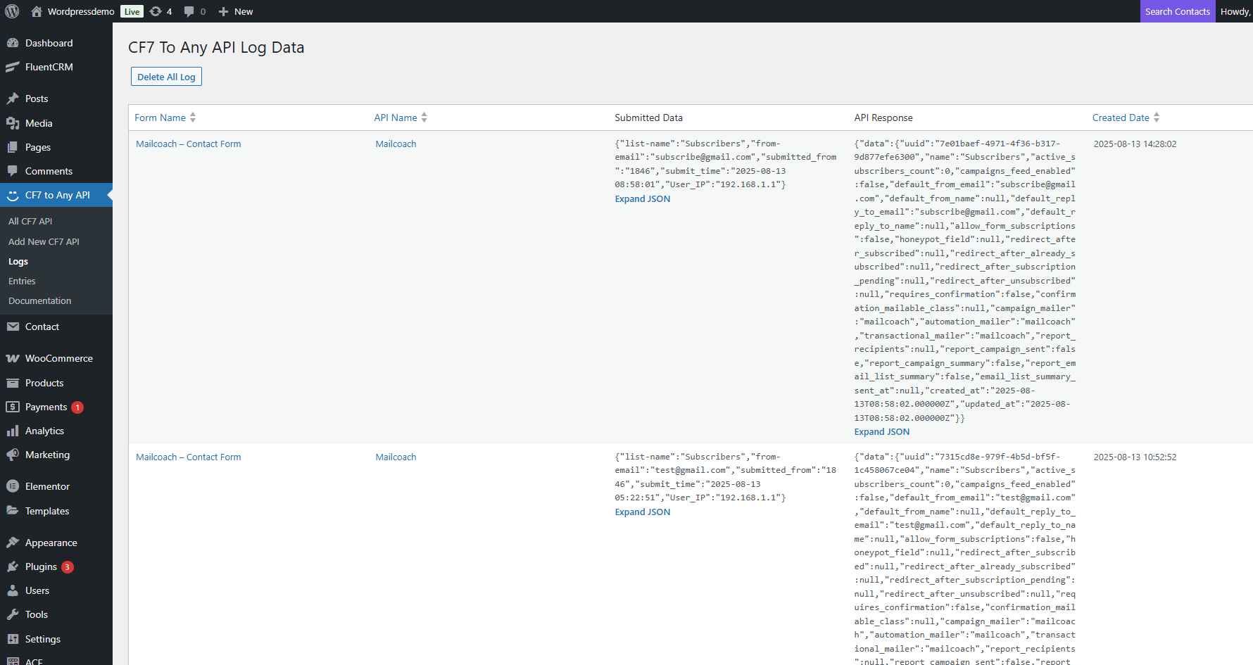 - To check logs: Go to the Log Menu in the CF7 to Any API plugin.