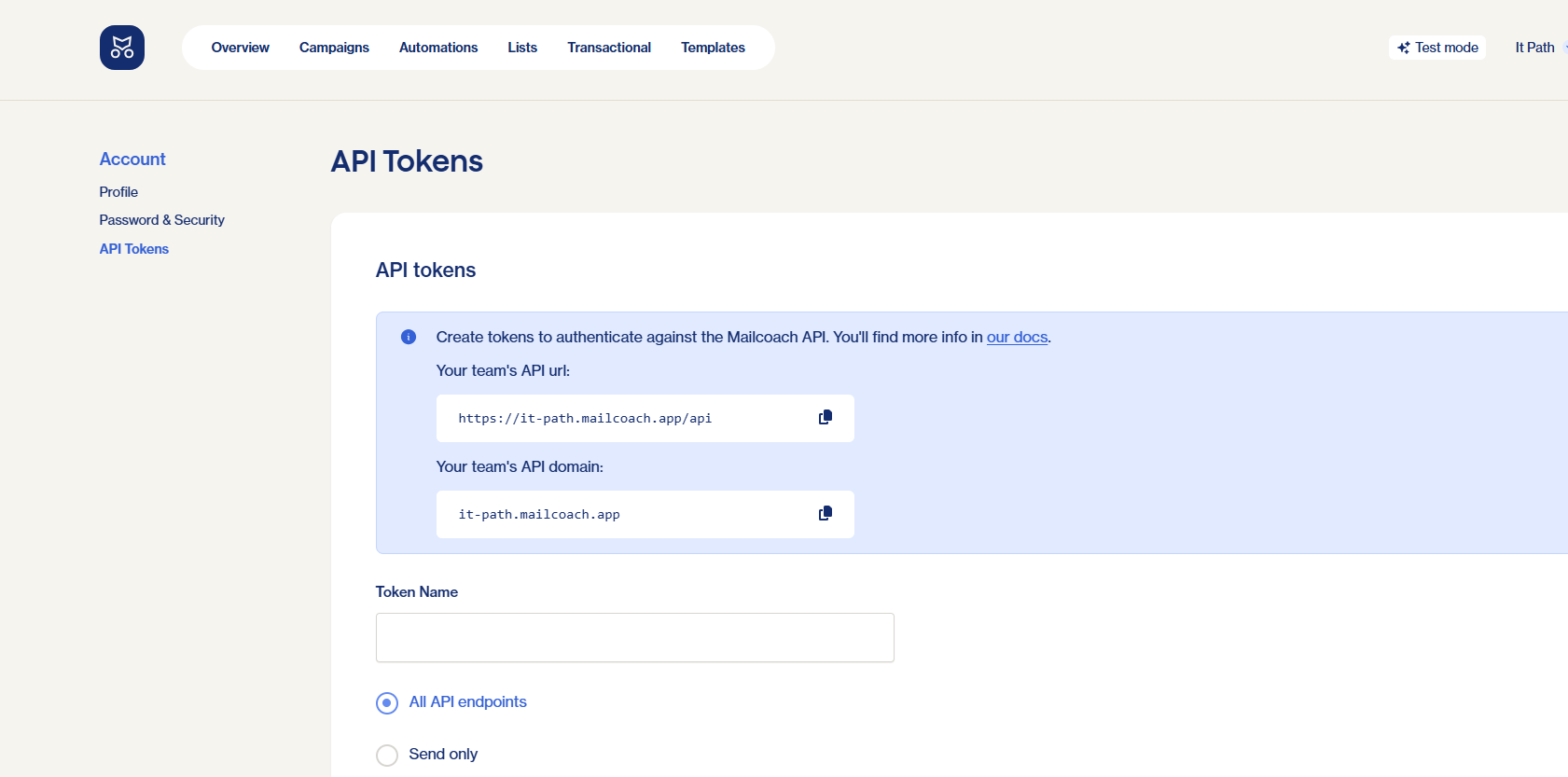 - Enter your Mailcoach API URL in the following format: https://it-path.mailcoach.app/api/email-lists